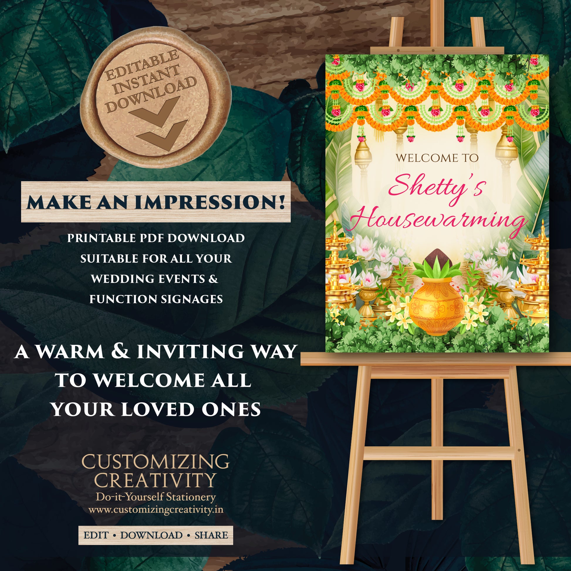 This DIY Housewarming sign template or Indian Gruhapravesham sign, a fusion welcome sign in traditional elegance, is complemented with florals & leaves, perfect for your Indian house welcome celebrations.