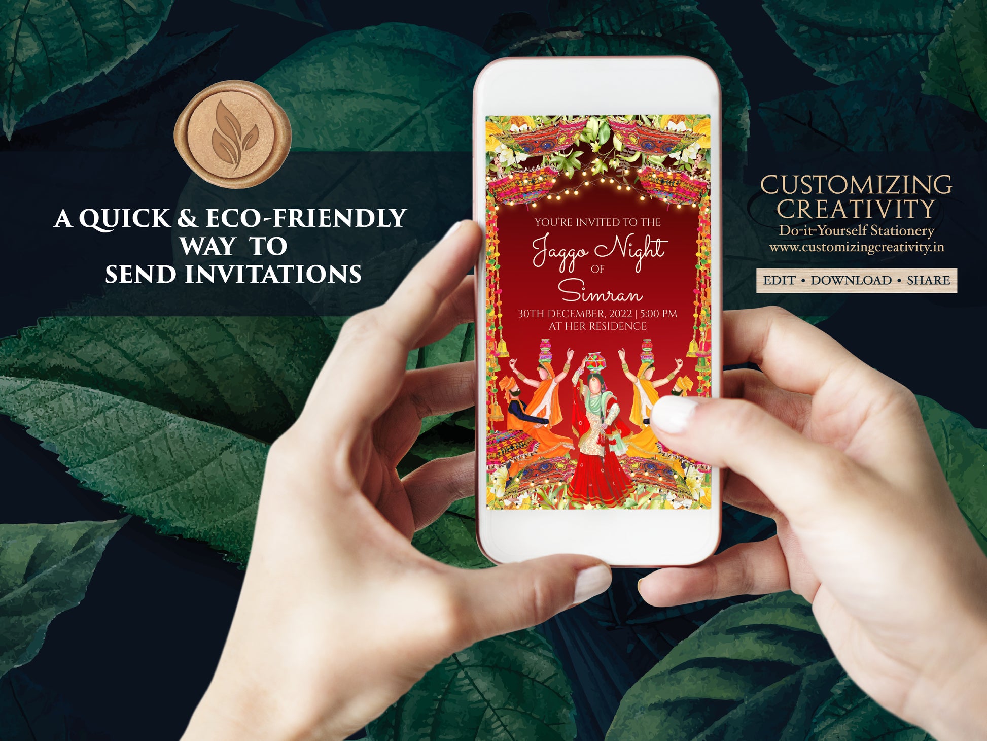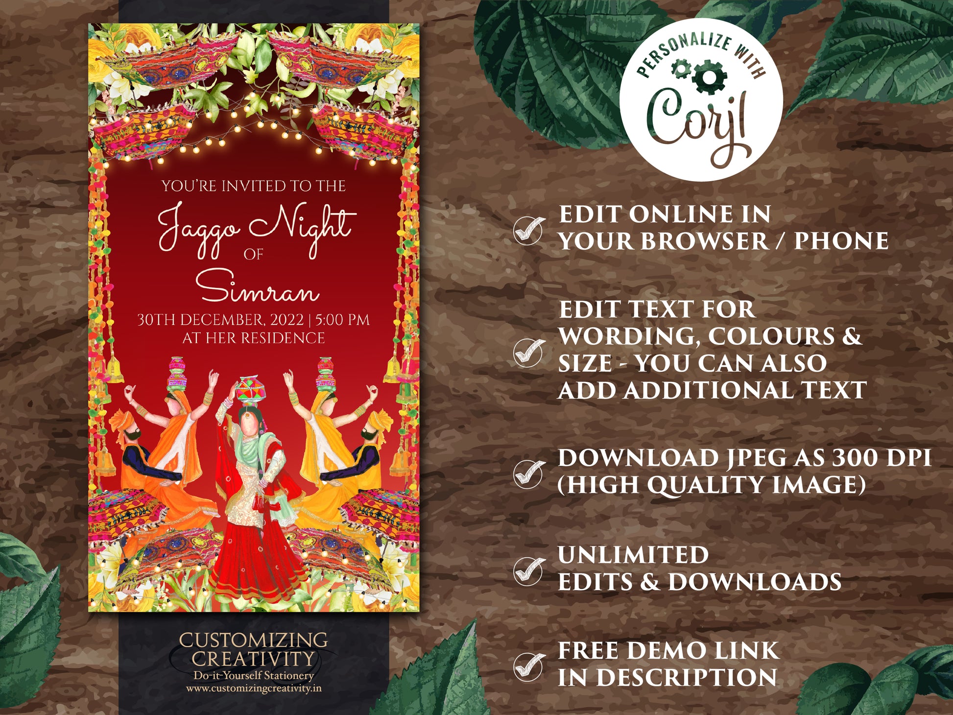 This DIY Punjabi Jaggo invitation template Wedding or Jago invitations, a fusion invite in traditional elegance, is complemented with Indian truck art, perfect for your Jaggo function invite celebrations.