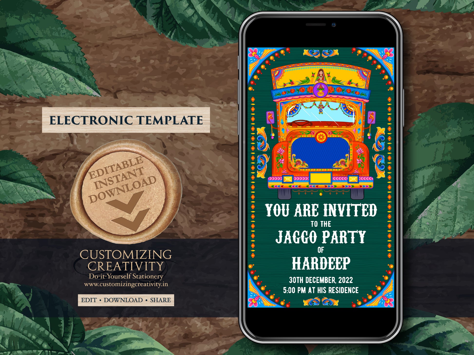 This DIY Punjabi Jaggo invitation template Wedding or Jago invitations, a fusion invite in traditional elegance, is complemented with Indian truck art, perfect for your Jaggo function invite celebrations.